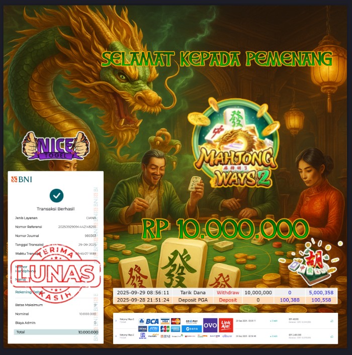 Selamat kepada User id : APE23** Telah berhasil mendapatkan kemenangan besar pada permainan JACKPOT SLOT MAHYONG WAYS 2 Dengan kemenangan Sebesar Rp.10.000.000,- Setelah mengisi formulir withdraw dengan kurung waktu hanya 5 – 10 menit pihak NICETOGEL sudah melakukan transfer kepada pemilik Userid dan dana sudah dapat di cairkan oleh pemenang. Bukti pembayaran yang kami berikan merupakan bukti pembayaran yang SAH / VALID yang langung di dapatkan melaui tanda transfer transaksi dari Bank yang di tuju.