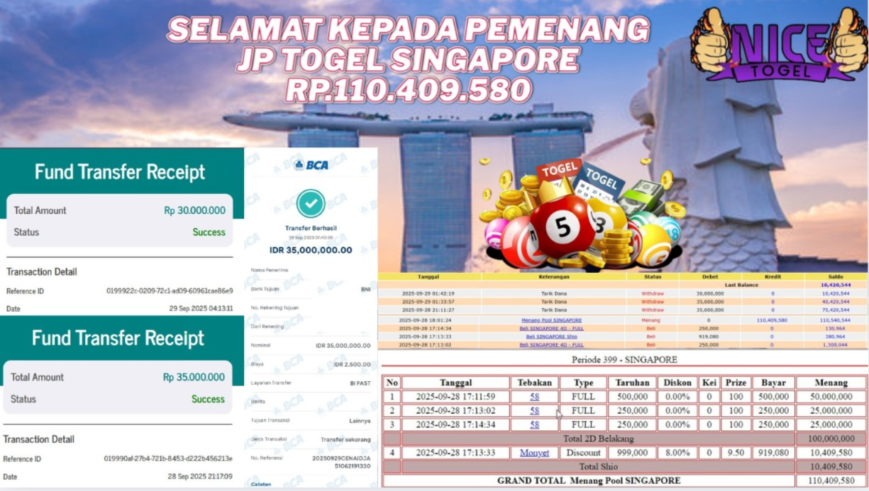 Selamat kepada User id : KIHA** Telah berhasil mendapatkan kemenangan besar pada permainan JACKPOT TOGEL SINGAPORE Dengan kemenangan Sebesar Rp.110.409.580,- Setelah mengisi formulir withdraw dengan kurung waktu hanya 5 – 10 menit pihak NICETOGEL sudah melakukan transfer kepada pemilik Userid dan dana sudah dapat di cairkan oleh pemenang. Bukti pembayaran yang kami berikan merupakan bukti pembayaran yang SAH / VALID yang langung di dapatkan melaui tanda transfer transaksi dari Bank yang di tuju.