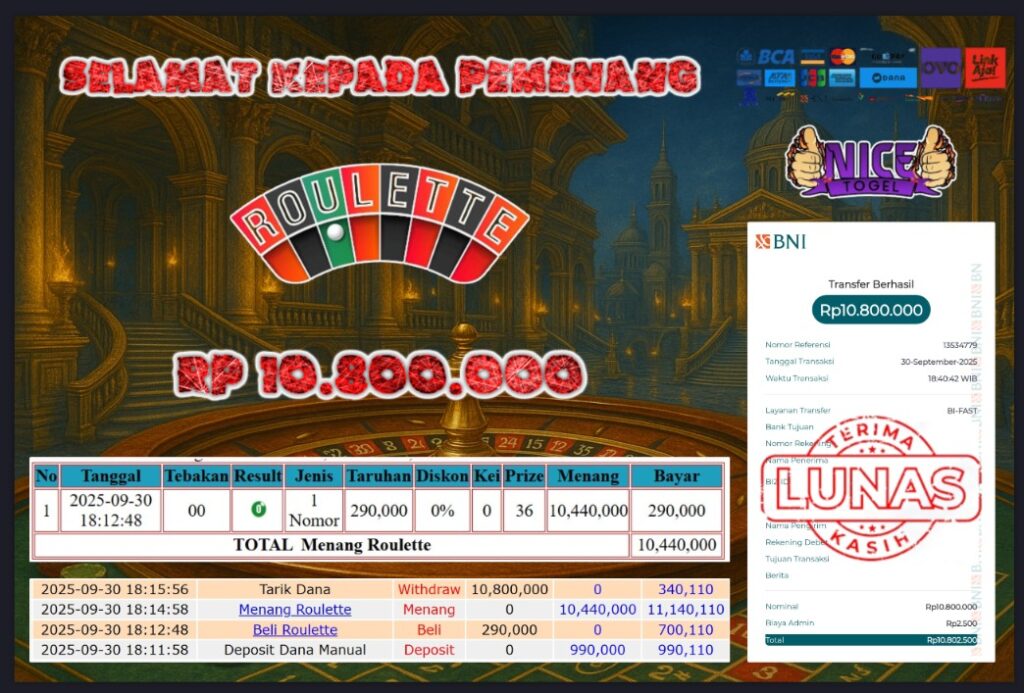 Selamat kepada User id :APE23*** Telah berhasil mendapatkan kemenangan besar pada permainan JACKPOT LIVE GAME ROULETTE Dengan kemenangan Sebesar Rp.10.000.000,- Setelah mengisi formulir withdraw dengan kurung waktu hanya 5 – 10 menit pihak NICETOGEL sudah melakukan transfer kepada pemilik Userid dan dana sudah dapat di cairkan oleh pemenang. Bukti pembayaran yang kami berikan merupakan bukti pembayaran yang SAH / VALID yang langung di dapatkan melaui tanda transfer transaksi dari Bank yang di tuju.