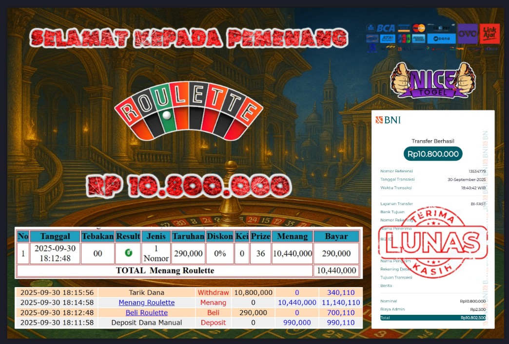 Selamat kepada User id :APE23*** Telah berhasil mendapatkan kemenangan besar pada permainan JACKPOT LIVE GAME ROULETTE Dengan kemenangan Sebesar Rp.10.000.000,- Setelah mengisi formulir withdraw dengan kurung waktu hanya 5 – 10 menit pihak NICETOGEL sudah melakukan transfer kepada pemilik Userid dan dana sudah dapat di cairkan oleh pemenang. Bukti pembayaran yang kami berikan merupakan bukti pembayaran yang SAH / VALID yang langung di dapatkan melaui tanda transfer transaksi dari Bank yang di tuju.