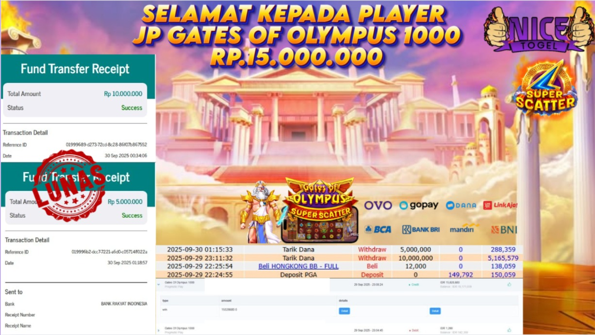 Selamat kepada User id : APE23** Telah berhasil mendapatkan kemenangan besar pada permainan JACKPOT SLOT GATES OF OLYMPUS 1000 Dengan kemenangan Sebesar Rp.15.000.000,- Setelah mengisi formulir withdraw dengan kurung waktu hanya 5 – 10 menit pihak NICETOGEL sudah melakukan transfer kepada pemilik Userid dan dana sudah dapat di cairkan oleh pemenang. Bukti pembayaran yang kami berikan merupakan bukti pembayaran yang SAH / VALID yang langung di dapatkan melaui tanda transfer transaksi dari Bank yang di tuju.