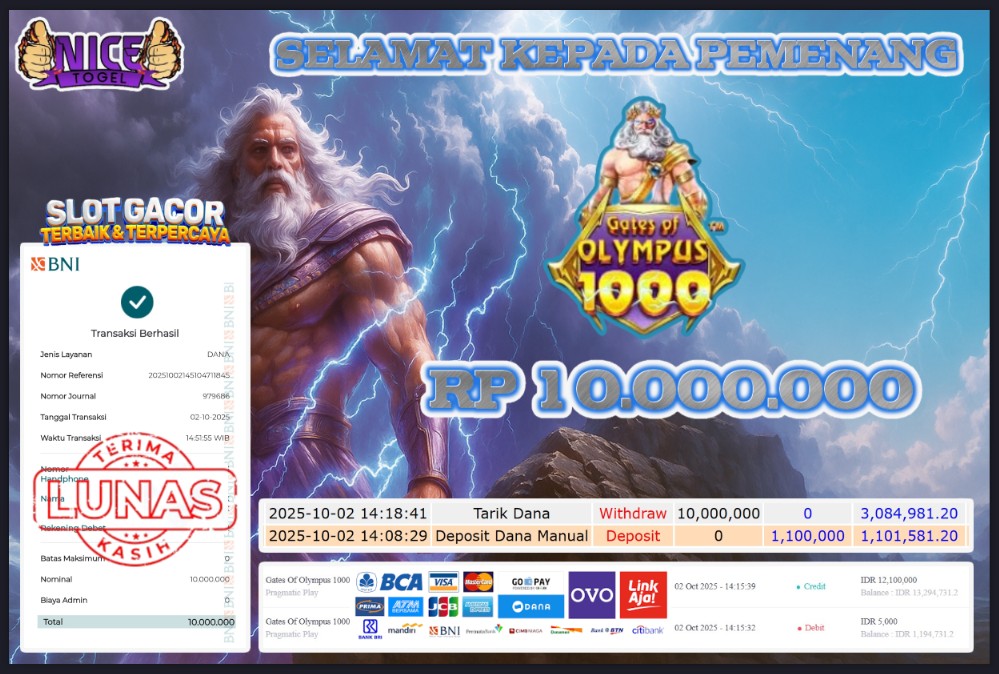 Selamat kepada User id : APE23** Telah berhasil mendapatkan kemenangan besar pada permainan JACKPOT SLOT GATES OF OLYMPUS 1000 Dengan kemenangan Sebesar Rp.10.000.000,- Setelah mengisi formulir withdraw dengan kurung waktu hanya 5 – 10 menit pihak NICETOGEL sudah melakukan transfer kepada pemilik Userid dan dana sudah dapat di cairkan oleh pemenang. Bukti pembayaran yang kami berikan merupakan bukti pembayaran yang SAH / VALID yang langung di dapatkan melaui tanda transfer transaksi dari Bank yang di tuju.