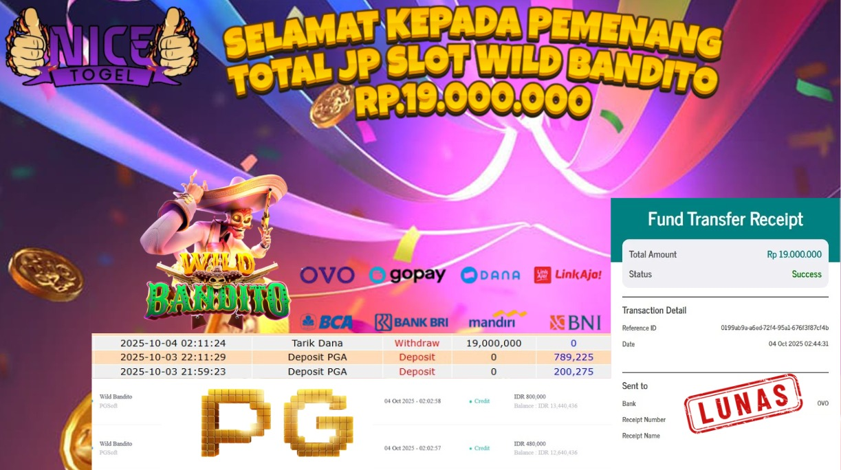 Selamat kepada User id : APE23** Telah berhasil mendapatkan kemenangan besar pada permainan JACKPOT SLOT WILD BANDITO Dengan kemenangan Sebesar Rp.19.000.000,- Setelah mengisi formulir withdraw dengan kurung waktu hanya 5 – 10 menit pihak NICETOGEL sudah melakukan transfer kepada pemilik Userid dan dana sudah dapat di cairkan oleh pemenang. Bukti pembayaran yang kami berikan merupakan bukti pembayaran yang SAH / VALID yang langung di dapatkan melaui tanda transfer transaksi dari Bank yang di tuju.