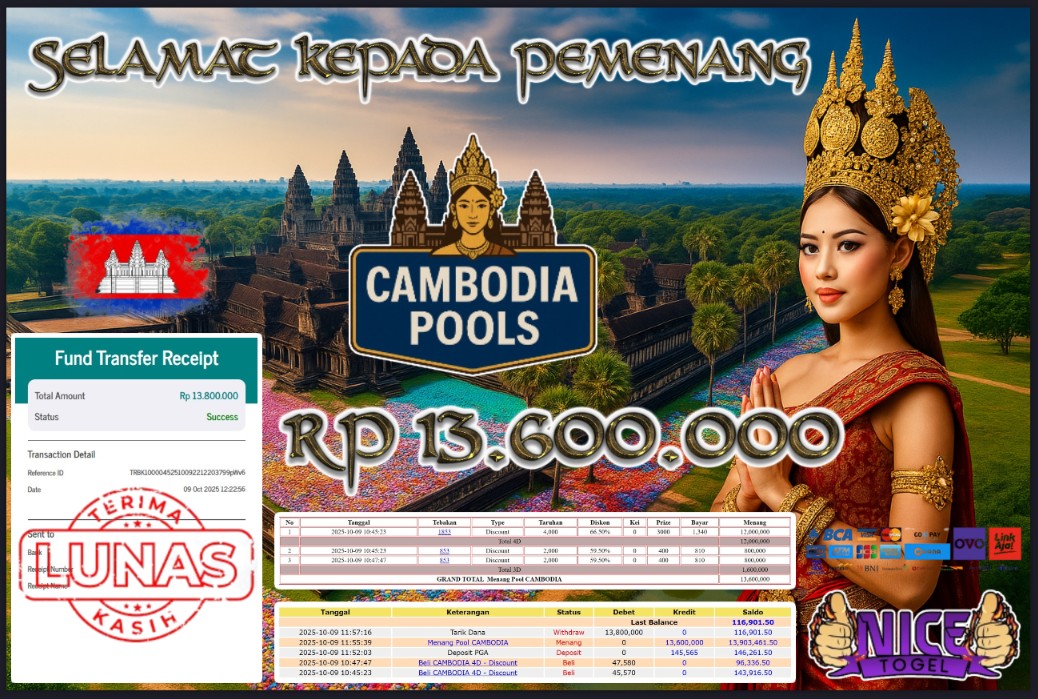 Selamat kepada member NICETOGEL User id : LAY** Telah berhasil mendapatkan kemenangan besar pada permainan JACKPOT TOGEL CAMBODIA POOLS Dengan kemenangan Sebesar Rp.13.600.000,- Setelah mengisi formulir withdraw dengan kurung waktu hanya 5 – 10 menit pihak NICETOGEL sudah melakukan transfer kepada pemilik Userid dan dana sudah dapat di cairkan oleh pemenang. Bukti pembayaran yang kami berikan merupakan bukti pembayaran yang SAH / VALID yang langung di dapatkan melaui tanda transfer transaksi dari Bank yang di tuju.