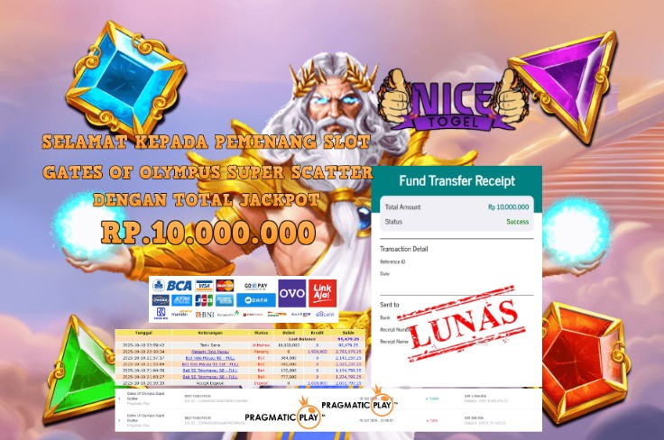 Selamat kepada User id : JAM** Telah berhasil mendapatkan kemenangan besar pada permainan JACKPOT SLOT GATES OF OLYMPUS SUPER SCATTER Dengan kemenangan Sebesar Rp. 10.000.000,- Setelah mengisi formulir withdraw dengan kurung waktu hanya 5 – 10 menit pihak NICETOGEL sudah melakukan transfer kepada pemilik Userid dan dana sudah dapat di cairkan oleh pemenang. Bukti pembayaran yang kami berikan merupakan bukti pembayaran yang SAH / VALID yang langung di dapatkan melaui tanda transfer transaksi dari Bank yang di tuju.