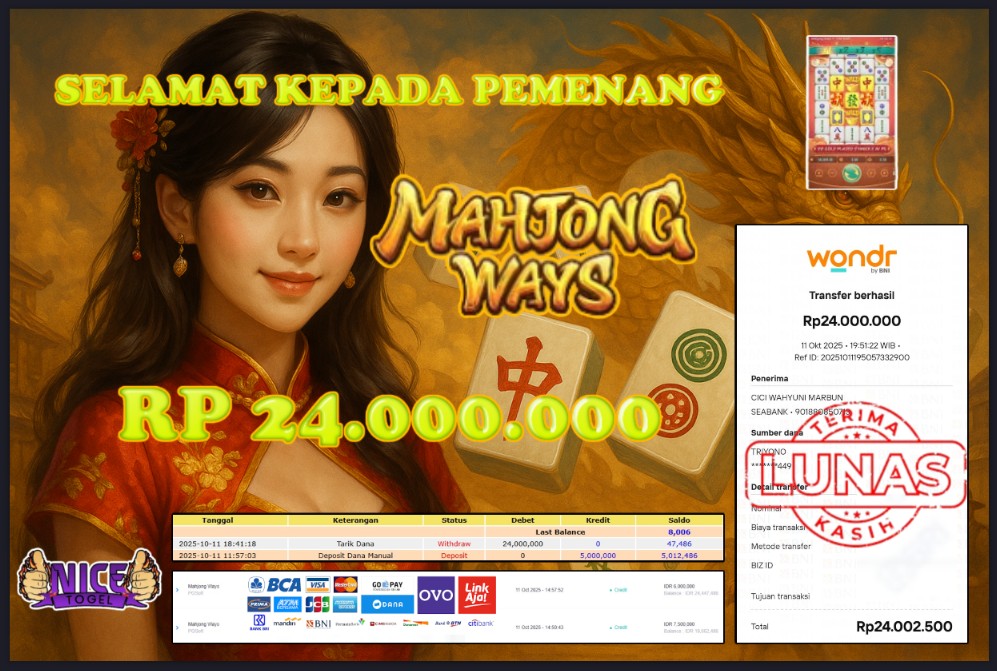 Selamat kepada User id : HYS36** Telah berhasil mendapatkan kemenangan besar pada permainan JACKPOT SLOT MAHYONG WAYS Dengan kemenangan Sebesar Rp.24.000.000,- Setelah mengisi formulir withdraw dengan kurung waktu hanya 5 – 10 menit pihak NICETOGEL sudah melakukan transfer kepada pemilik Userid dan dana sudah dapat di cairkan oleh pemenang. Bukti pembayaran yang kami berikan merupakan bukti pembayaran yang SAH / VALID yang langung di dapatkan melaui tanda transfer transaksi dari Bank yang di tuju.