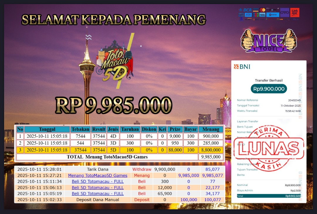 Selamat kepada User id : CLINT** Telah berhasil mendapatkan kemenangan besar pada permainan JACKPOT TOGEL TOTOMACAU 5D Dengan kemenangan Sebesar Rp.9.985.000,- Setelah mengisi formulir withdraw dengan kurung waktu hanya 5 – 10 menit pihak NICETOGEL sudah melakukan transfer kepada pemilik Userid dan dana sudah dapat di cairkan oleh pemenang. Bukti pembayaran yang kami berikan merupakan bukti pembayaran yang SAH / VALID yang langung di dapatkan melaui tanda transfer transaksi dari Bank yang di tuju.