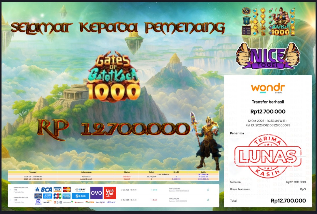 Selamat kepada User id : STFR** Telah berhasil mendapatkan kemenangan besar pada permainan JACKPOT SLOT GATES OF GATOT KACA 1000 Dengan kemenangan Sebesar Rp.12.700.000,- Setelah mengisi formulir withdraw dengan kurung waktu hanya 5 – 10 menit pihak NICETOGEL sudah melakukan transfer kepada pemilik Userid dan dana sudah dapat di cairkan oleh pemenang. Bukti pembayaran yang kami berikan merupakan bukti pembayaran yang SAH / VALID yang langung di dapatkan melaui tanda transfer transaksi dari Bank yang di tuju.