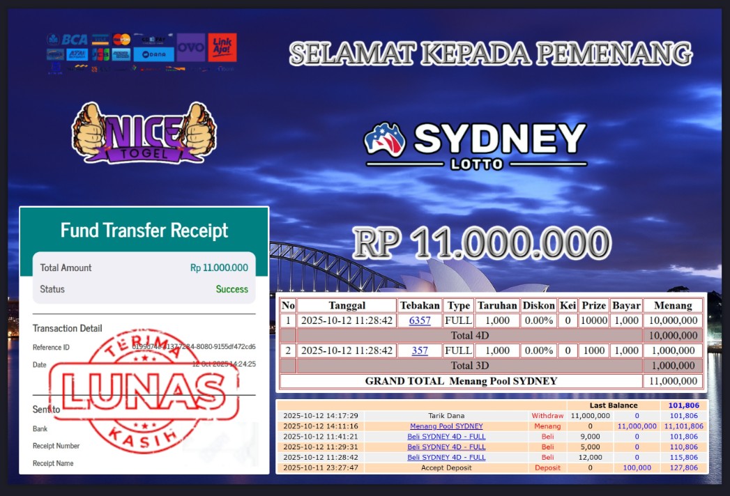 Selamat kepada User id : CYSSS** Telah berhasil mendapatkan kemenangan besar pada permainan JACKPOT TOGEL SYDNEY LOTTO Dengan kemenangan Sebesar Rp.10.000.000,- Setelah mengisi formulir withdraw dengan kurung waktu hanya 5 – 10 menit pihak NICETOGEL sudah melakukan transfer kepada pemilik Userid dan dana sudah dapat di cairkan oleh pemenang. Bukti pembayaran yang kami berikan merupakan bukti pembayaran yang SAH / VALID yang langung di dapatkan melaui tanda transfer transaksi dari Bank yang di tuju.