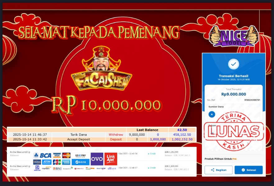 Selamat kepada User id : BULD** Telah berhasil mendapatkan kemenangan besar pada permainan JACKPOT SLOT FA CAI SHEN Dengan kemenangan Sebesar Rp.10.000.000,- Setelah mengisi formulir withdraw dengan kurung waktu hanya 5 – 10 menit pihak NICETOGEL sudah melakukan transfer kepada pemilik Userid dan dana sudah dapat di cairkan oleh pemenang. Bukti pembayaran yang kami berikan merupakan bukti pembayaran yang SAH / VALID yang langung di dapatkan melaui tanda transfer transaksi dari Bank yang di tuju.