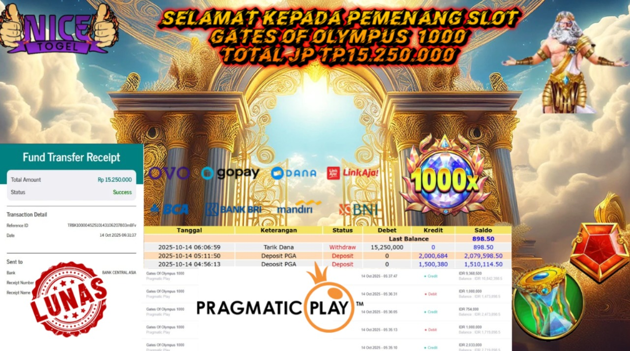 Selamat kepada User id : GUGU** Telah berhasil mendapatkan kemenangan besar pada permainan JACKPOT SLOT GATES OF OLYMPUS 1000 Dengan kemenangan Sebesar Rp. 15.250.000,- Setelah mengisi formulir withdraw dengan kurung waktu hanya 5 – 10 menit pihak NICETOGEL sudah melakukan transfer kepada pemilik Userid dan dana sudah dapat di cairkan oleh pemenang. Bukti pembayaran yang kami berikan merupakan bukti pembayaran yang SAH / VALID yang langung di dapatkan melaui tanda transfer transaksi dari Bank yang di tuju.