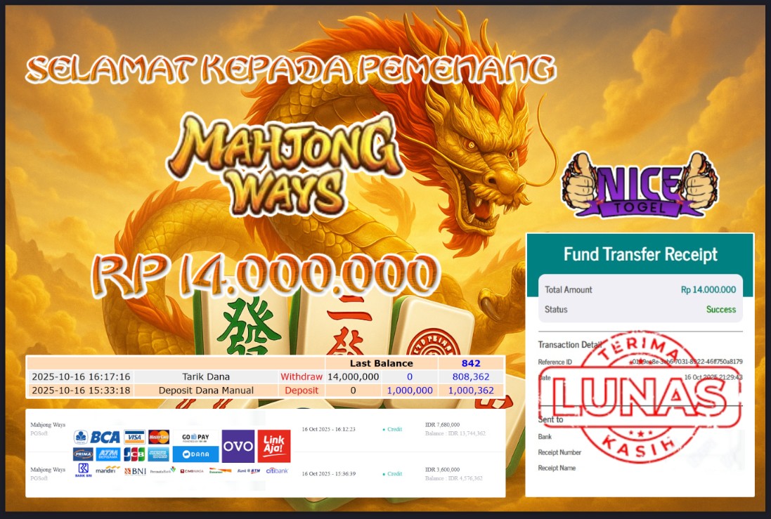 Selamat kepada User id : PROK** Telah berhasil mendapatkan kemenangan besar pada permainan JACKPOT SLOT MAHYONG WAYS Dengan kemenangan Sebesar Rp.10.000.000,- Setelah mengisi formulir withdraw dengan kurung waktu hanya 5 – 10 menit pihak NICETOGEL sudah melakukan transfer kepada pemilik Userid dan dana sudah dapat di cairkan oleh pemenang. Bukti pembayaran yang kami berikan merupakan bukti pembayaran yang SAH / VALID yang langung di dapatkan melaui tanda transfer transaksi dari Bank yang di tuju.