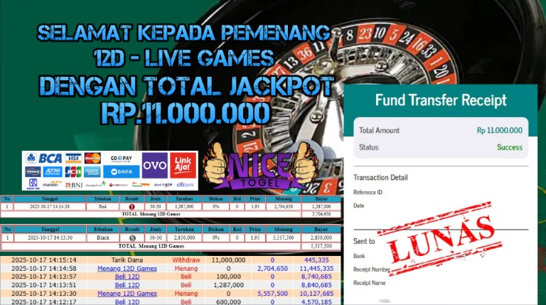 Selamat kepada User id : KLIN8** Telah berhasil mendapatkan kemenangan besar pada permainan JACKPOT 12D LIVE GAMES Dengan kemenangan Sebesar Rp.11.000.000,- Setelah mengisi formulir withdraw dengan kurung waktu hanya 5 – 10 menit pihak NICETOGEL sudah melakukan transfer kepada pemilik Userid dan dana sudah dapat di cairkan oleh pemenang. Bukti pembayaran yang kami berikan merupakan bukti pembayaran yang SAH / VALID yang langung di dapatkan melaui tanda transfer transaksi dari Bank yang di tuju.