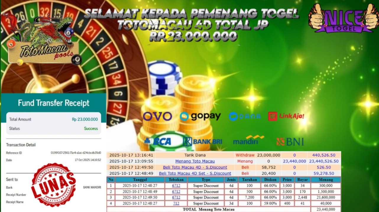 Selamat kepada User id : WIRA** Telah berhasil mendapatkan kemenangan besar pada permainan JACKPOT TOGEL TOTOMACAU 4D Dengan kemenangan Sebesar Rp.23.000.000,- Setelah mengisi formulir withdraw dengan kurung waktu hanya 5 – 10 menit pihak NICETOGEL sudah melakukan transfer kepada pemilik Userid dan dana sudah dapat di cairkan oleh pemenang. Bukti pembayaran yang kami berikan merupakan bukti pembayaran yang SAH / VALID yang langung di dapatkan melaui tanda transfer transaksi dari Bank yang di tuju.
