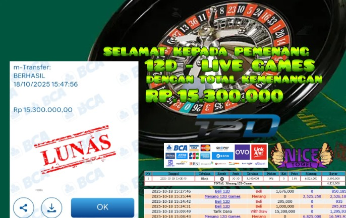 Selamat kepada User id : LING** Telah berhasil mendapatkan kemenangan besar pada permainan JACKPOT 12D – LIVE GAMES Dengan kemenangan Sebesar Rp.15.300.000,- Setelah mengisi formulir withdraw dengan kurung waktu hanya 5 – 10 menit pihak NICETOGEL sudah melakukan transfer kepada pemilik Userid dan dana sudah dapat di cairkan oleh pemenang. Bukti pembayaran yang kami berikan merupakan bukti pembayaran yang SAH / VALID yang langung di dapatkan melaui tanda transfer transaksi dari Bank yang di tuju.