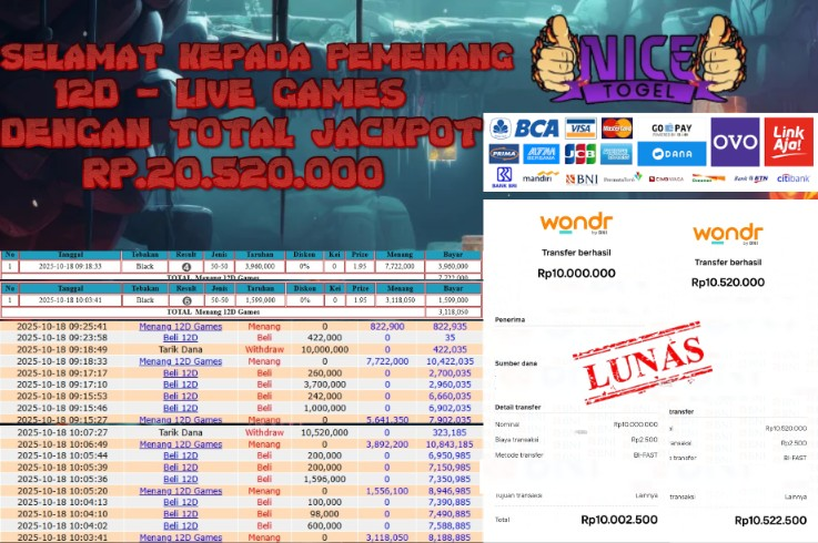 Selamat kepada User id : DUN17** Telah berhasil mendapatkan kemenangan besar pada permainan JACKPOT 12D – LIVE GAMES Dengan kemenangan Sebesar Rp.20.520.000,- Setelah mengisi formulir withdraw dengan kurung waktu hanya 5 – 10 menit pihak NICETOGEL sudah melakukan transfer kepada pemilik Userid dan dana sudah dapat di cairkan oleh pemenang. Bukti pembayaran yang kami berikan merupakan bukti pembayaran yang SAH / VALID yang langung di dapatkan melaui tanda transfer transaksi dari Bank yang di tuju.