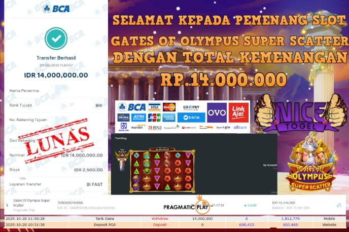Selamat kepada User id : BOGEN** Telah berhasil mendapatkan kemenangan besar pada permainan JACKPOT SLOT GATES OF OLYMPUS SUPER SCATTER Dengan kemenangan Sebesar Rp.14.000.000,- Setelah mengisi formulir withdraw dengan kurung waktu hanya 5 – 10 menit pihak NICETOGEL sudah melakukan transfer kepada pemilik Userid dan dana sudah dapat di cairkan oleh pemenang. Bukti pembayaran yang kami berikan merupakan bukti pembayaran yang SAH / VALID yang langung di dapatkan melaui tanda transfer transaksi dari Bank yang di tuju.