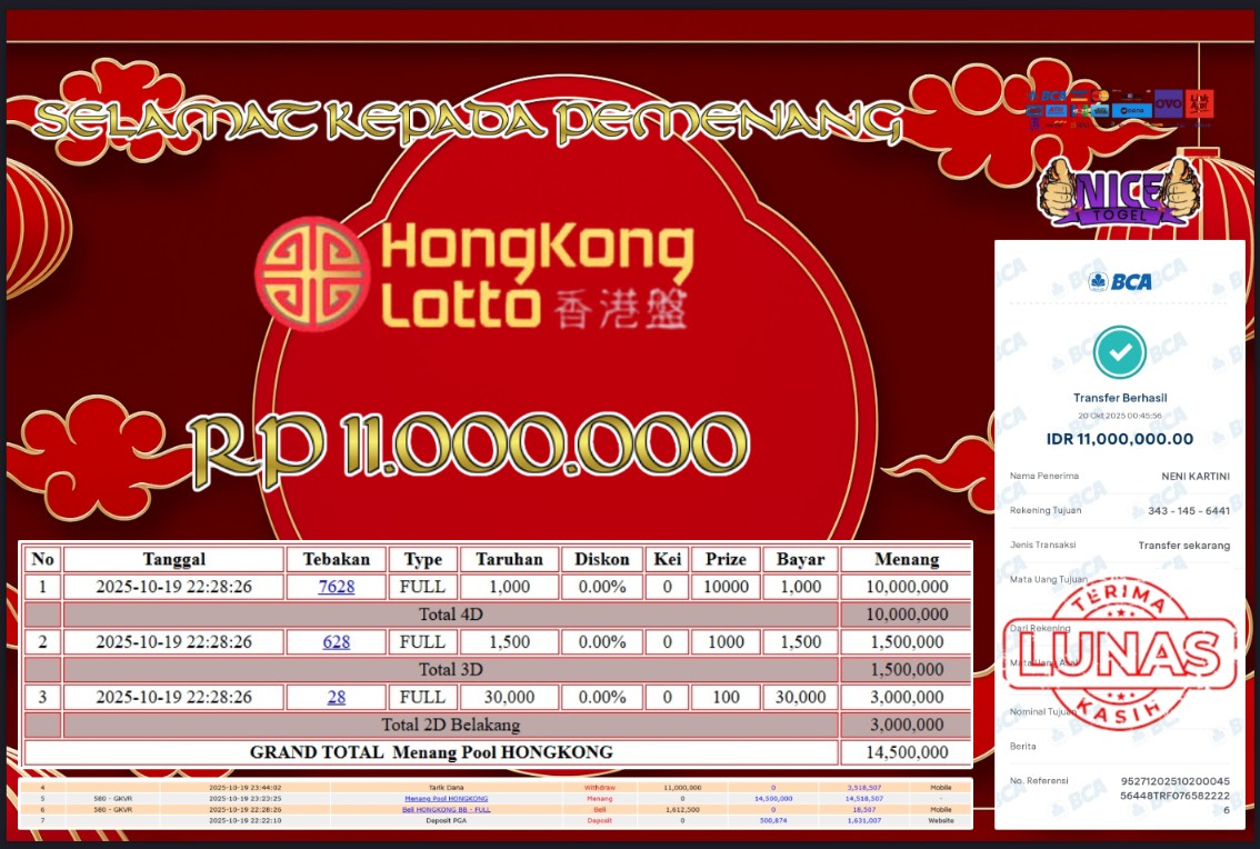 Selamat kepada User id : MINS** Telah berhasil mendapatkan kemenangan besar pada permainan JACKPOT TOGEL HONGKONG LOTTO Dengan kemenangan Sebesar Rp.11.000.000,- Setelah mengisi formulir withdraw dengan kurung waktu hanya 5 – 10 menit pihak NICETOGEL sudah melakukan transfer kepada pemilik Userid dan dana sudah dapat di cairkan oleh pemenang. Bukti pembayaran yang kami berikan merupakan bukti pembayaran yang SAH / VALID yang langung di dapatkan melaui tanda transfer transaksi dari Bank yang di tuju.