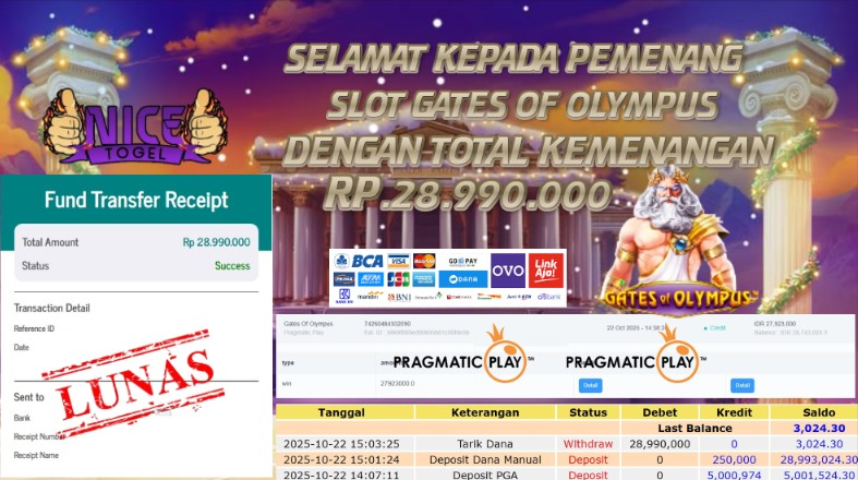 Selamat kepada User id : ANDIN7**** Telah berhasil mendapatkan kemenangan besar pada permainan JACKPOT SLOT GATES OF OLYMPUS Dengan kemenangan Sebesar Rp.28.990.000,- Setelah mengisi formulir withdraw dengan kurung waktu hanya 5 – 10 menit pihak NICETOGEL sudah melakukan transfer kepada pemilik Userid dan dana sudah dapat di cairkan oleh pemenang. Bukti pembayaran yang kami berikan merupakan bukti pembayaran yang SAH / VALID yang langung di dapatkan melaui tanda transfer transaksi dari Bank yang di tuju.