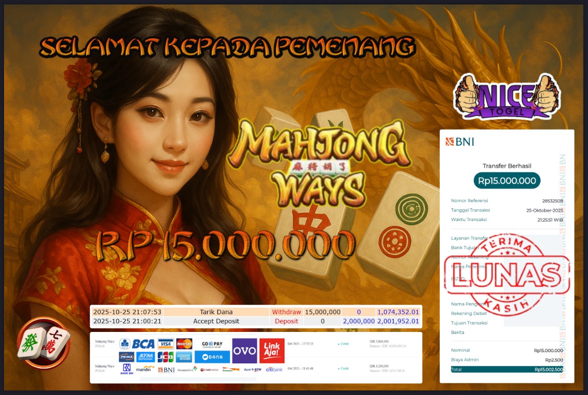 Selamat kepada User id : LAMINE** Telah berhasil mendapatkan kemenangan besar pada permainan JACKPOT SLOT MAHYONG WAYS 2 Dengan kemenangan Sebesar Rp.15.000.000,- Setelah mengisi formulir withdraw dengan kurung waktu hanya 5 – 10 menit pihak NICETOGEL sudah melakukan transfer kepada pemilik Userid dan dana sudah dapat di cairkan oleh pemenang. Bukti pembayaran yang kami berikan merupakan bukti pembayaran yang SAH / VALID yang langung di dapatkan melaui tanda transfer transaksi dari Bank yang di tuju.