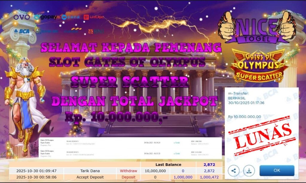 Selamat kepada User id : JON**** Telah berhasil mendapatkan kemenangan besar pada permainan JACKPOT SLOT GATES OF OLYMPUS SUPER SCATTER Dengan kemenangan Sebesar Rp.10.000.000,- Setelah mengisi formulir withdraw dengan kurung waktu hanya 5 – 10 menit pihak NICETOGEL sudah melakukan transfer kepada pemilik Userid dan dana sudah dapat di cairkan oleh pemenang. Bukti pembayaran yang kami berikan merupakan bukti pembayaran yang SAH / VALID yang langung di dapatkan melaui tanda transfer transaksi dari Bank yang di tuju.