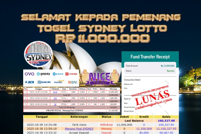 Selamat kepada User id : BEBYU**** Telah berhasil mendapatkan kemenangan besar pada permainan JACKPOT TOGEL TOGEL SDYNEY Dengan kemenangan Sebesar Rp.11.000.000,- Setelah mengisi formulir withdraw dengan kurung waktu hanya 5 – 10 menit pihak NICETOGEL sudah melakukan transfer kepada pemilik Userid dan dana sudah dapat di cairkan oleh pemenang. Bukti pembayaran yang kami berikan merupakan bukti pembayaran yang SAH / VALID yang langung di dapatkan melaui tanda transfer transaksi dari Bank yang di tuju.