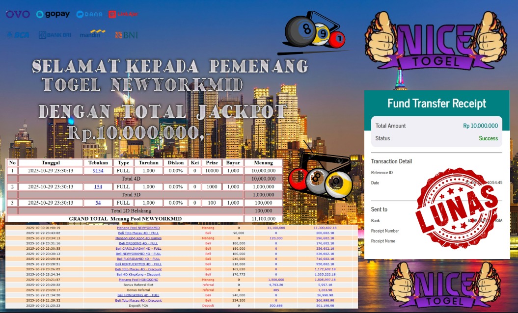 Selamat kepada User id : HER**** Telah berhasil mendapatkan kemenangan besar pada permainan JACKPOT TOGEL NEWYORKMID Dengan kemenangan Sebesar Rp.10.000.000,- Setelah mengisi formulir withdraw dengan kurung waktu hanya 5 – 10 menit pihak NICETOGEL sudah melakukan transfer kepada pemilik Userid dan dana sudah dapat di cairkan oleh pemenang. Bukti pembayaran yang kami berikan merupakan bukti pembayaran yang SAH / VALID yang langung di dapatkan melaui tanda transfer transaksi dari Bank yang di tuju.