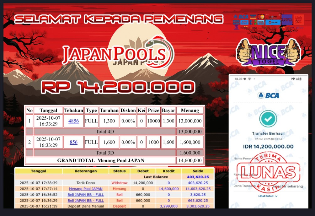 Selamat kepada User id : NHYT*** Telah berhasil mendapatkan kemenangan besar pada permainan JACKPOT TOGEL JAPAN POOLS Dengan kemenangan Sebesar … Baca Selengkapnya...