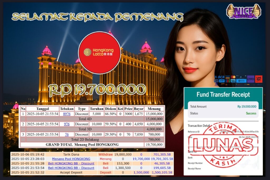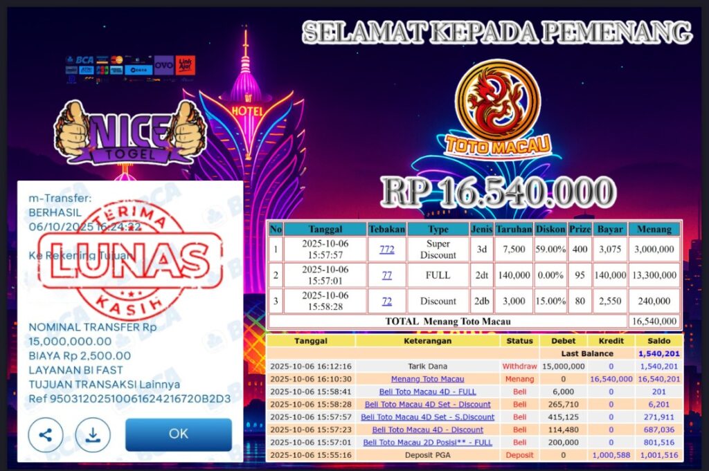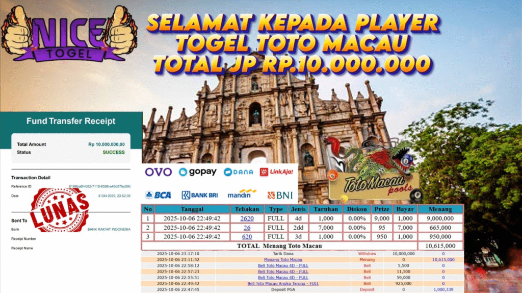 Selamat kepada User id : VYT22** Telah berhasil mendapatkan kemenangan besar pada permainan JACKPOT TOGEL TOTOMACAU 5D Dengan kemenangan Sebesar … Baca Selengkapnya...