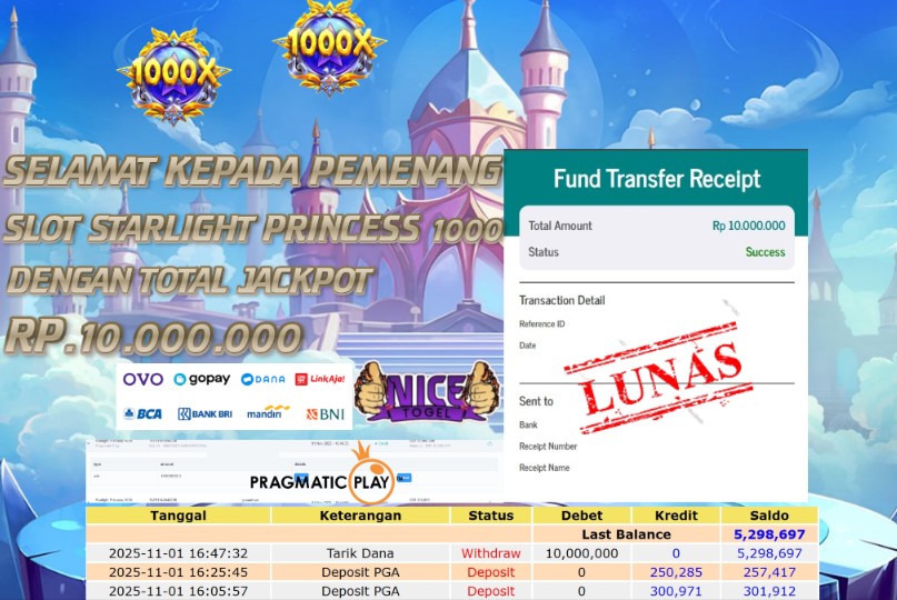 Selamat kepada User id : AISS00**** Telah berhasil mendapatkan kemenangan besar pada permainan JACKPOT SLOT GATES OF OLYMPUS Dengan kemenangan Sebesar Rp.26.900.000,- Setelah mengisi formulir withdraw dengan kurung waktu hanya 5 – 10 menit pihak NICETOGEL sudah melakukan transfer kepada pemilik Userid dan dana sudah dapat di cairkan oleh pemenang. Bukti pembayaran yang kami berikan merupakan bukti pembayaran yang SAH / VALID yang langung di dapatkan melaui tanda transfer transaksi dari Bank yang di tuju.
