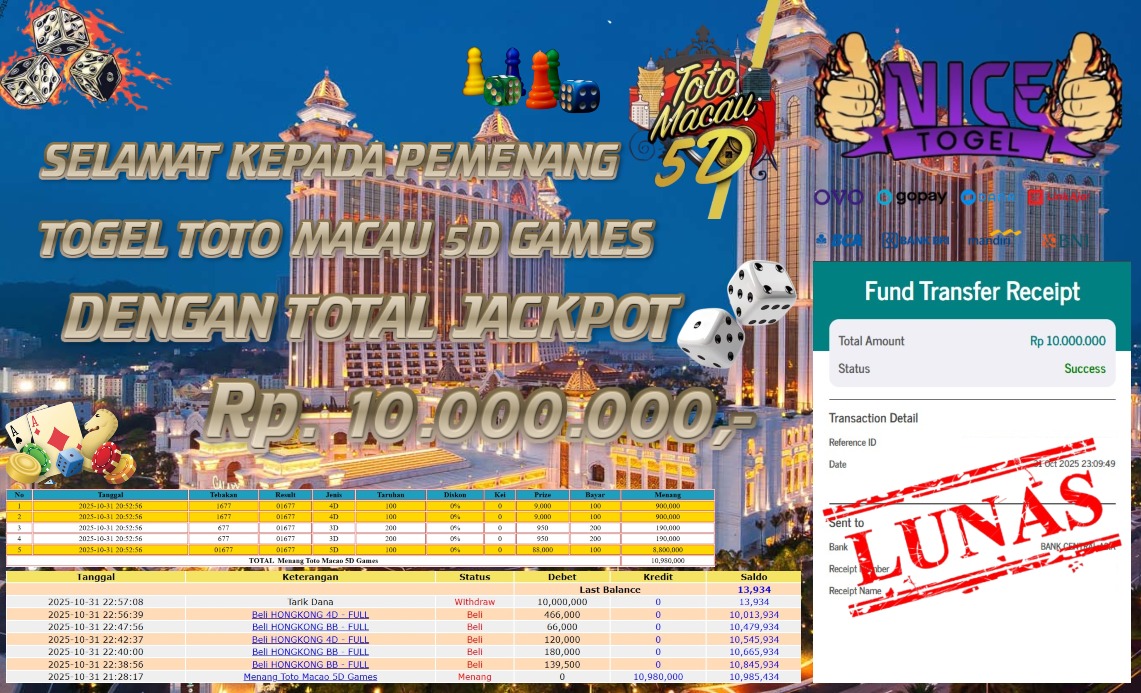 Selamat kepada User id : RAG**** Telah berhasil mendapatkan kemenangan besar pada permainan JACKPOT TOGEL TOTO MACAU 5D GAMES Dengan kemenangan Sebesar Rp.10.000.000,- Setelah mengisi formulir withdraw dengan kurung waktu hanya 5 – 10 menit pihak NICETOGEL sudah melakukan transfer kepada pemilik Userid dan dana sudah dapat di cairkan oleh pemenang. Bukti pembayaran yang kami berikan merupakan bukti pembayaran yang SAH / VALID yang langung di dapatkan melaui tanda transfer transaksi dari Bank yang di tuju.