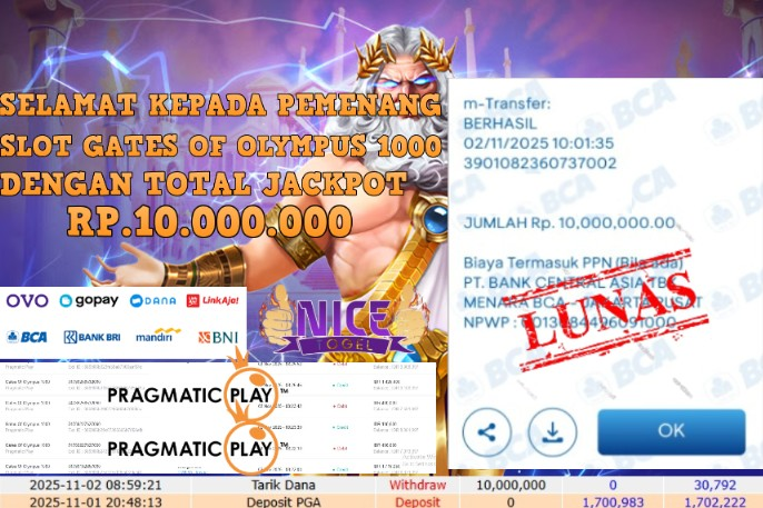 Selamat kepada User id : JUNE**** Telah berhasil mendapatkan kemenangan besar pada permainan JACKPOT SLOT GATES OF OLYMPUS 1000 Dengan kemenangan Sebesar Rp.10.000.000,- Setelah mengisi formulir withdraw dengan kurung waktu hanya 5 – 10 menit pihak NICETOGEL sudah melakukan transfer kepada pemilik Userid dan dana sudah dapat di cairkan oleh pemenang. Bukti pembayaran yang kami berikan merupakan bukti pembayaran yang SAH / VALID yang langung di dapatkan melaui tanda transfer transaksi dari Bank yang di tuju.