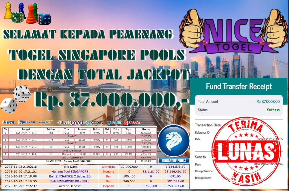 Selamat kepada User id : KANG**** Telah berhasil mendapatkan kemenangan besar pada permainan JACKPOT TOGEL SINGAPORE POOLS Dengan kemenangan Sebesar Rp.37.000.000,- Setelah mengisi formulir withdraw dengan kurung waktu hanya 5 – 10 menit pihak NICETOGEL sudah melakukan transfer kepada pemilik Userid dan dana sudah dapat di cairkan oleh pemenang. Bukti pembayaran yang kami berikan merupakan bukti pembayaran yang SAH / VALID yang langung di dapatkan melaui tanda transfer transaksi dari Bank yang di tuju.