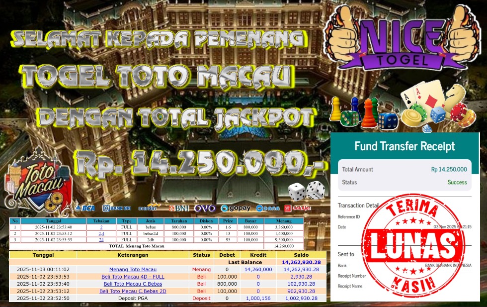 Selamat kepada User id : DUN12**** Telah berhasil mendapatkan kemenangan besar pada permainan JACKPOT TOGEL TOTO MACAU Dengan kemenangan Sebesar Rp.14.250.000,- Setelah mengisi formulir withdraw dengan kurung waktu hanya 5 – 10 menit pihak NICETOGEL sudah melakukan transfer kepada pemilik Userid dan dana sudah dapat di cairkan oleh pemenang. Bukti pembayaran yang kami berikan merupakan bukti pembayaran yang SAH / VALID yang langung di dapatkan melaui tanda transfer transaksi dari Bank yang di tuju.