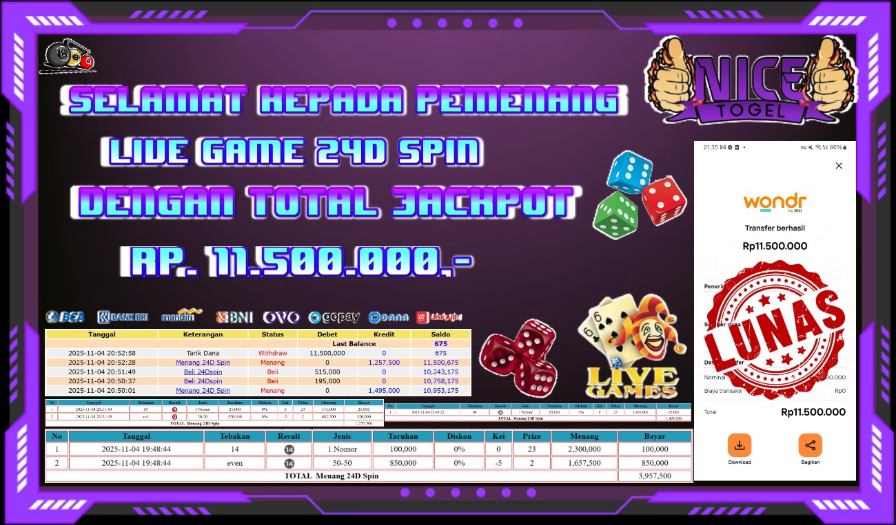 Selamat kepada User id : ALD**** Telah berhasil mendapatkan kemenangan besar pada permainan JACKPOT 24D SPIN LIVE GAMES Dengan kemenangan Sebesar Rp.11.500.000,- Setelah mengisi formulir withdraw dengan kurung waktu hanya 5 – 10 menit pihak NICETOGEL sudah melakukan transfer kepada pemilik Userid dan dana sudah dapat di cairkan oleh pemenang. Bukti pembayaran yang kami berikan merupakan bukti pembayaran yang SAH / VALID yang langung di dapatkan melaui tanda transfer transaksi dari Bank yang di tuju.