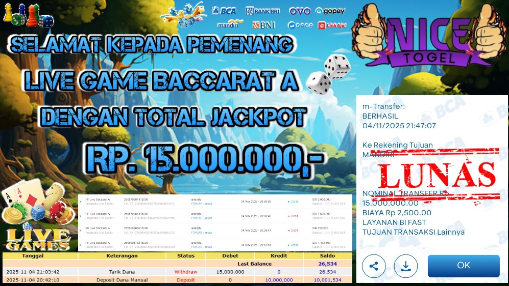 Selamat kepada User id : BAG**** Telah berhasil mendapatkan kemenangan besar pada permainan JACKPOT PP LIVE GAME BACCARAT A Dengan kemenangan Sebesar Rp.15.00.000,- Setelah mengisi formulir withdraw dengan kurung waktu hanya 5 – 10 menit pihak NICETOGEL sudah melakukan transfer kepada pemilik Userid dan dana sudah dapat di cairkan oleh pemenang. Bukti pembayaran yang kami berikan merupakan bukti pembayaran yang SAH / VALID yang langung di dapatkan melaui tanda transfer transaksi dari Bank yang di tuju.