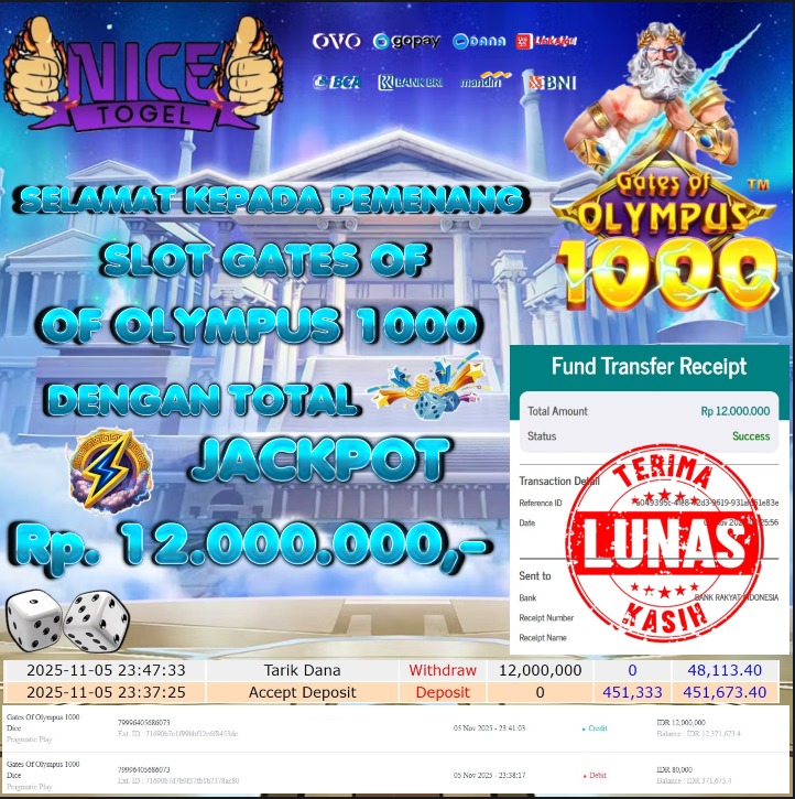 Selamat kepada User id : DAN**** Telah berhasil mendapatkan kemenangan besar pada permainan JACKPOT SLOT GATES OF OLYMPUS 1000 Dengan kemenangan Sebesar Rp.12.000.000,- Setelah mengisi formulir withdraw dengan kurung waktu hanya 5 – 10 menit pihak NICETOGEL sudah melakukan transfer kepada pemilik Userid dan dana sudah dapat di cairkan oleh pemenang. Bukti pembayaran yang kami berikan merupakan bukti pembayaran yang SAH / VALID yang langung di dapatkan melaui tanda transfer transaksi dari Bank yang di tuju.