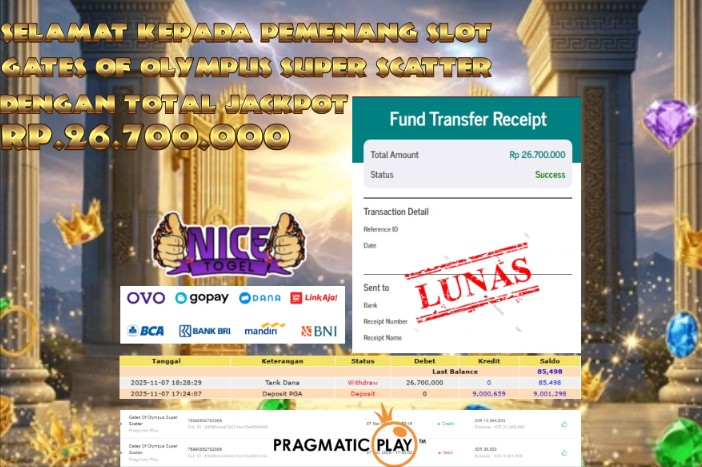Selamat kepada User id : JUNED**** Telah berhasil mendapatkan kemenangan besar pada permainan JACKPOT SLOT GATES OF OLYMPUS SUPER SCATTER Dengan kemenangan Sebesar Rp.26.700.000,- Setelah mengisi formulir withdraw dengan kurung waktu hanya 5 – 10 menit pihak NICETOGEL sudah melakukan transfer kepada pemilik Userid dan dana sudah dapat di cairkan oleh pemenang. Bukti pembayaran yang kami berikan merupakan bukti pembayaran yang SAH / VALID yang langung di dapatkan melaui tanda transfer transaksi dari Bank yang di tuju.