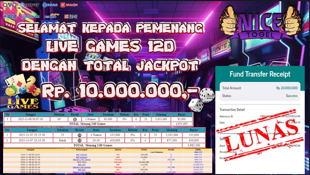 Selamat kepada User id : GUS**** Telah berhasil mendapatkan kemenangan besar pada permainan JACKPOT LIVE GAME 12D Dengan kemenangan Sebesar Rp.10.000.000,- Setelah mengisi formulir withdraw dengan kurung waktu hanya 5 – 10 menit pihak NICETOGEL sudah melakukan transfer kepada pemilik Userid dan dana sudah dapat di cairkan oleh pemenang. Bukti pembayaran yang kami berikan merupakan bukti pembayaran yang SAH / VALID yang langung di dapatkan melaui tanda transfer transaksi dari Bank yang di tuju.