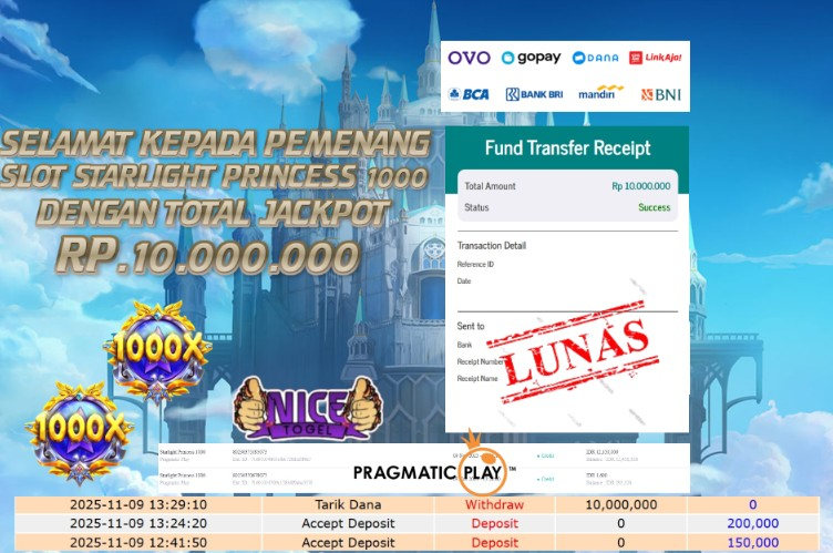 Selamat kepada User id : LALD**** Telah berhasil mendapatkan kemenangan besar pada permainan JACKPOT SLOT SLOT STARLIGHT PRINCESS 1000 Dengan kemenangan Sebesar Rp.10.00.000,- Setelah mengisi formulir withdraw dengan kurung waktu hanya 5 – 10 menit pihak NICETOGEL sudah melakukan transfer kepada pemilik Userid dan dana sudah dapat di cairkan oleh pemenang. Bukti pembayaran yang kami berikan merupakan bukti pembayaran yang SAH / VALID yang langung di dapatkan melaui tanda transfer transaksi dari Bank yang di tuju.
