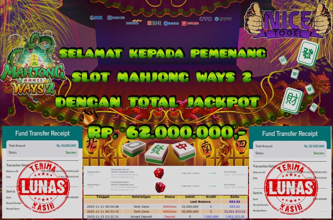 Selamat kepada User id : RAG**** Telah berhasil mendapatkan kemenangan besar pada permainan JACKPOT SLOT MAHJONG WASY 2 Dengan kemenangan Sebesar Rp. 62.000.000,- Setelah mengisi formulir withdraw dengan kurung waktu hanya 5 – 10 menit pihak NICETOGEL sudah melakukan transfer kepada pemilik Userid dan dana sudah dapat di cairkan oleh pemenang. Bukti pembayaran yang kami berikan merupakan bukti pembayaran yang SAH / VALID yang langung di dapatkan melaui tanda transfer transaksi dari Bank yang di tuju.