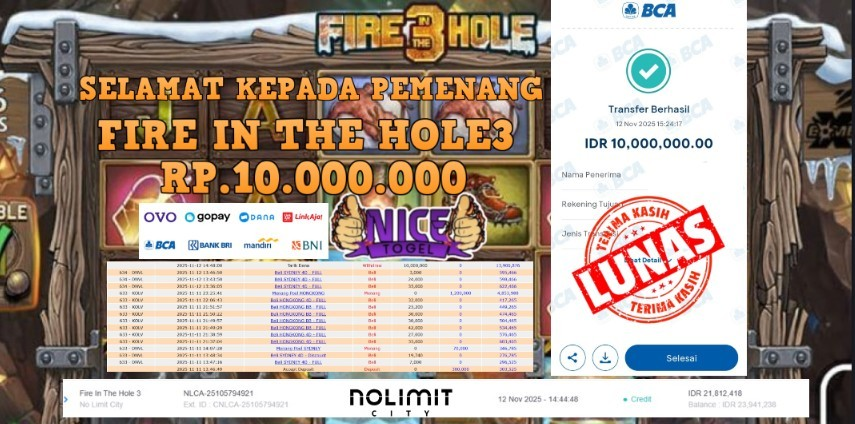 Selamat kepada User id : ANJRS**** Telah berhasil mendapatkan kemenangan besar pada permainan JACKPOT GAMES FIRE IN THE HOLES3 Dengan kemenangan Sebesar Rp.10.00.000,- Setelah mengisi formulir withdraw dengan kurung waktu hanya 5 – 10 menit pihak NICETOGEL sudah melakukan transfer kepada pemilik Userid dan dana sudah dapat di cairkan oleh pemenang. Bukti pembayaran yang kami berikan merupakan bukti pembayaran yang SAH / VALID yang langung di dapatkan melaui tanda transfer transaksi dari Bank yang di tuju.