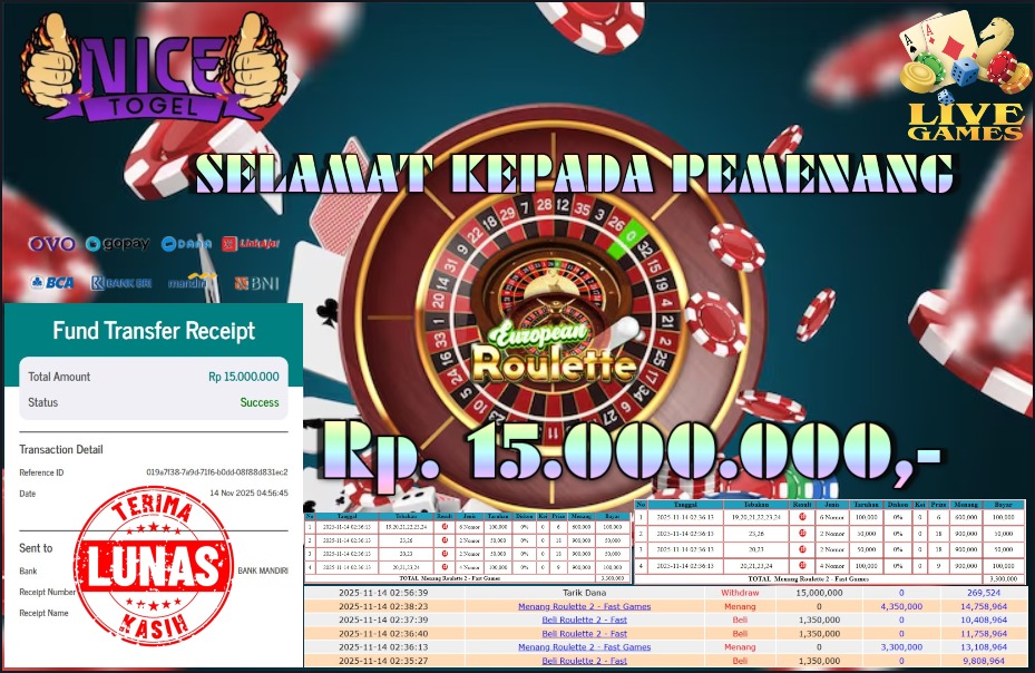 Selamat kepada User id : GIRI**** Telah berhasil mendapatkan kemenangan besar pada permainan JACKPOT LIVE GAMES ROULETTE2 Dengan kemenangan Sebesar Rp.15.000.000,- Setelah mengisi formulir withdraw dengan kurung waktu hanya 5 – 10 menit pihak NICETOGEL sudah melakukan transfer kepada pemilik Userid dan dana sudah dapat di cairkan oleh pemenang. Bukti pembayaran yang kami berikan merupakan bukti pembayaran yang SAH / VALID yang langung di dapatkan melaui tanda transfer transaksi dari Bank yang di tuju.