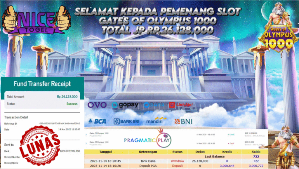 Selamat kepada User id : GIRI**** Telah berhasil mendapatkan kemenangan besar pada permainan JACKPOT LIVE GAMES ROULETTE2 Dengan kemenangan Sebesar Rp.15.000.000,- Setelah mengisi formulir withdraw dengan kurung waktu hanya 5 – 10 menit pihak NICETOGEL sudah melakukan transfer kepada pemilik Userid dan dana sudah dapat di cairkan oleh pemenang. Bukti pembayaran yang kami berikan merupakan bukti pembayaran yang SAH / VALID yang langung di dapatkan melaui tanda transfer transaksi dari Bank yang di tuju.