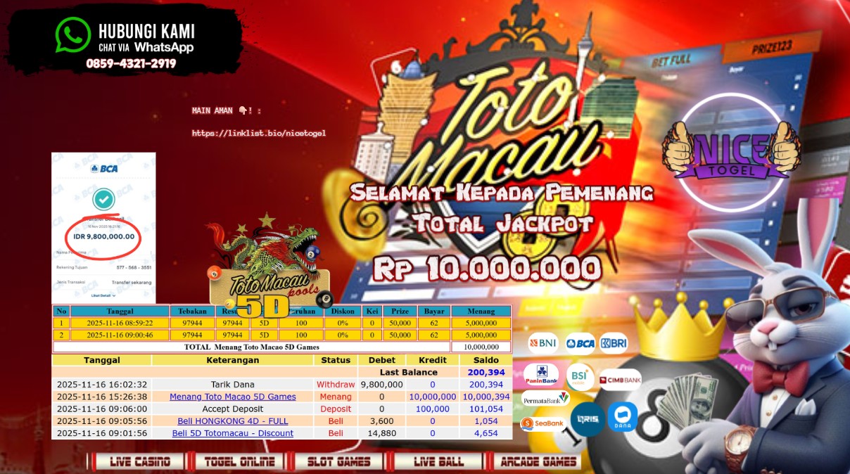 Selamat kepada User id : DAVID**** Telah berhasil mendapatkan kemenangan besar pada permainan JACKPOT TOTO MACAU 5D Dengan kemenangan Sebesar Rp.10.000.000,- Setelah mengisi formulir withdraw dengan kurung waktu hanya 5 – 10 menit pihak NICETOGEL sudah melakukan transfer kepada pemilik Userid dan dana sudah dapat di cairkan oleh pemenang. Bukti pembayaran yang kami berikan merupakan bukti pembayaran yang SAH / VALID yang langung di dapatkan melaui tanda transfer transaksi dari Bank yang di tuju.