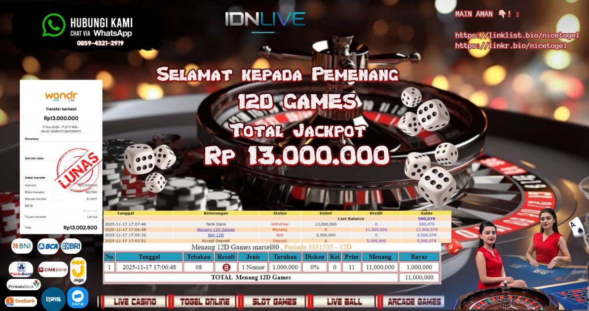 Selamat kepada User id : RET**** Telah berhasil mendapatkan kemenangan besar pada permainan JACKPOT TOGEL LIVE GAMES 12D Dengan kemenangan Sebesar Rp.13.000.000,- Setelah mengisi formulir withdraw dengan kurung waktu hanya 5 – 10 menit pihak NICETOGEL sudah melakukan transfer kepada pemilik Userid dan dana sudah dapat di cairkan oleh pemenang. Bukti pembayaran yang kami berikan merupakan bukti pembayaran yang SAH / VALID yang langung di dapatkan melaui tanda transfer transaksi dari Bank yang di tuju.
