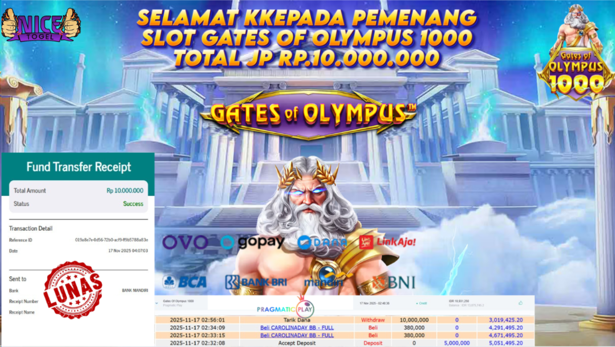 Selamat kepada User id : TATA**** Telah berhasil mendapatkan kemenangan besar pada permainan SLOT GATES OF OLYMPUS 1000 Dengan kemenangan Sebesar Rp.10.000.000,- Setelah mengisi formulir withdraw dengan kurung waktu hanya 5 – 10 menit pihak NICETOGEL sudah melakukan transfer kepada pemilik Userid dan dana sudah dapat di cairkan oleh pemenang. Bukti pembayaran yang kami berikan merupakan bukti pembayaran yang SAH / VALID yang langung di dapatkan melaui tanda transfer transaksi dari Bank yang di tuju.