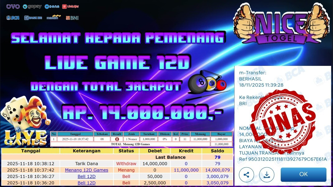 Selamat kepada User id : tokek**** Telah berhasil mendapatkan kemenangan besar pada permainan JACKPOT LIVE GAMES 12 – D Dengan kemenangan Sebesar Rp.14.000.000,- Setelah mengisi formulir withdraw dengan kurung waktu hanya 5 – 10 menit pihak NICETOGEL sudah melakukan transfer kepada pemilik Userid dan dana sudah dapat di cairkan oleh pemenang. Bukti pembayaran yang kami berikan merupakan bukti pembayaran yang SAH / VALID yang langung di dapatkan melaui tanda transfer transaksi dari Bank yang di tuju.