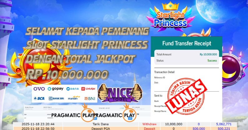 Selamat kepada User id : AIR**** Telah berhasil mendapatkan kemenangan besar pada permainan JACKPOT SLOT STARLIGHT PRINCESS Dengan kemenangan Sebesar Rp.10.000.000,- Setelah mengisi formulir withdraw dengan kurung waktu hanya 5 – 10 menit pihak NICETOGEL sudah melakukan transfer kepada pemilik Userid dan dana sudah dapat di cairkan oleh pemenang. Bukti pembayaran yang kami berikan merupakan bukti pembayaran yang SAH / VALID yang langung di dapatkan melaui tanda transfer transaksi dari Bank yang di tuju.