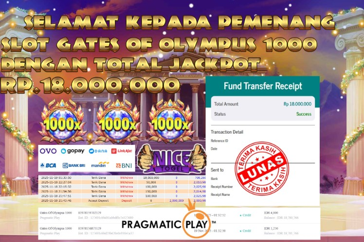 Selamat kepada User id : JAGUNG**** Telah berhasil mendapatkan kemenangan besar pada permainan JACKPOT SLOT GATES OF OLYMPUS 1000 Dengan kemenangan Sebesar Rp.18.000.000,- Setelah mengisi formulir withdraw dengan kurung waktu hanya 5 – 10 menit pihak NICETOGEL sudah melakukan transfer kepada pemilik Userid dan dana sudah dapat di cairkan oleh pemenang. Bukti pembayaran yang kami berikan merupakan bukti pembayaran yang SAH / VALID yang langung di dapatkan melaui tanda transfer transaksi dari Bank yang di tuju.